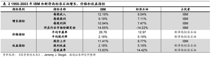 业绩增速更高≠投资回报率更优,估值也很重要。为何长期来看不断纳入高增长新兴产业公司的标普500指数反而跑输最初始的成分股组合?Jeremy J. Siegel在《投资者的未来》中指出,一个可能的答案是投资者为这些新兴公司的股票所支付的价格过高了,以至于无法得到较高的收益。由于个股层面的数据更加齐全,因此以新泽西标准石油(现名为埃克森美孚)和IBM为例来说明。IBM作为一家极具创新能力的高科技公司,在1950-2003年内其业绩增速明显高于作为传统企业的新泽西标准石油,但是由于市场对IBM的前景十分看好,为此支付了更高的估值溢价,可以发现1950-2003年期间IBM的平均市盈率约为新泽西标准石油的2倍。股价过高意味着股利率偏低,因此投资者通过股利再投资能够积累的股票数量也就相对更少。拆解1950-2003年内IBM和新泽西标准石油的投资回报率,尽管IBM在股价上涨幅度上超过新泽西标准石油,但由于后者通过股利再投资实现的收益率明显更高,因此最终新泽西标准石油的投资回报率反而强于业绩增速明显更高的IBM。