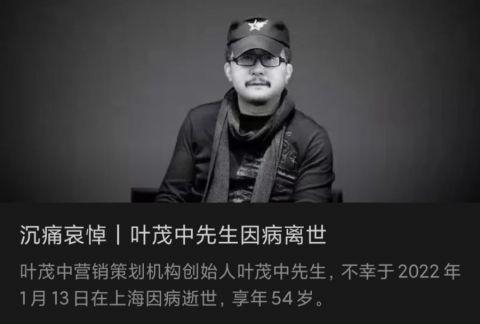 1月13日,中国著名营销策划专家和品牌管理专家叶茂中,因癌症晚期,在上海去世,年仅54岁。