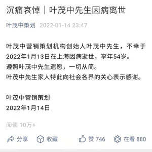 1月14日,上海叶茂中营销策划有限公司微信公号“叶茂中策划”发布消息,叶茂中营销策划机构创始人叶茂中于1月13日在上海因病逝世,享年54岁。 “遵照叶茂中先生遗愿,一切从简。叶茂中先生家人特此向社会各界的关心表示感谢”。
