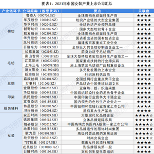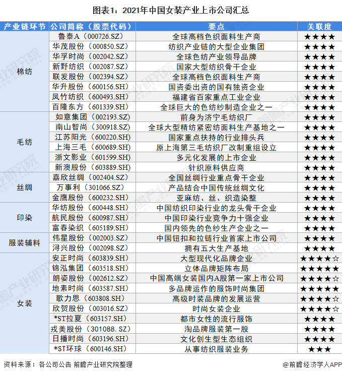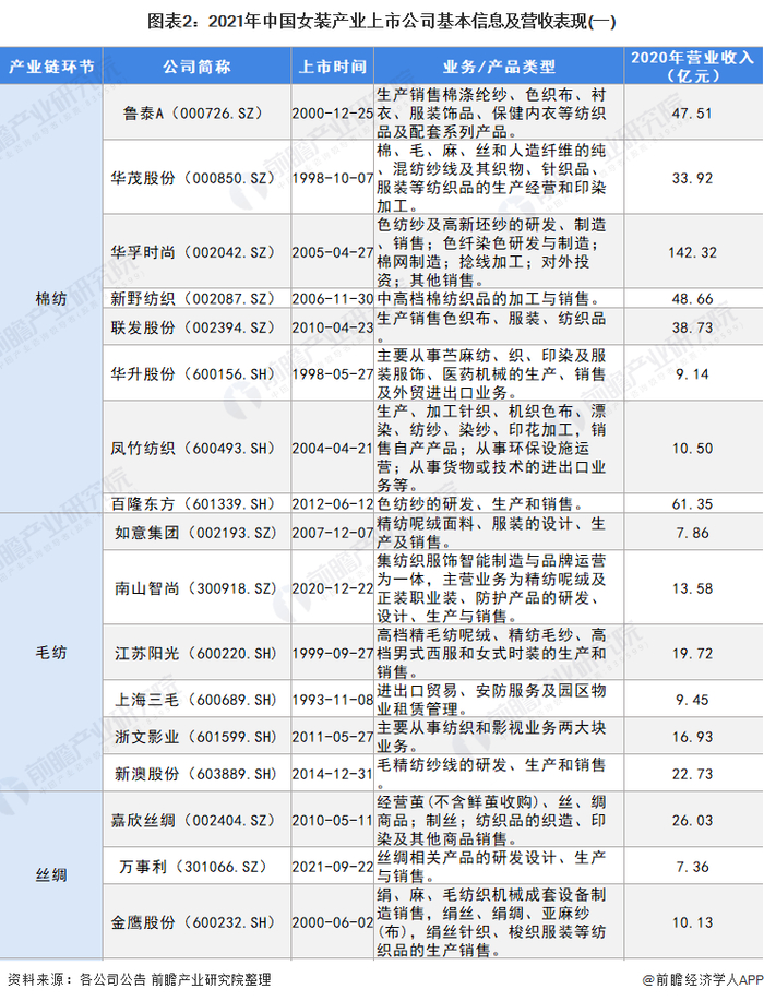 我国女装产业主要分为上游原材料企业,包括棉纺、毛纺、丝绸、印染、服装辅料等;中游为女装设计、生产及销售企业,代表有安正时尚、锦泓集团、朗姿股份、地素时尚、歌力思等。