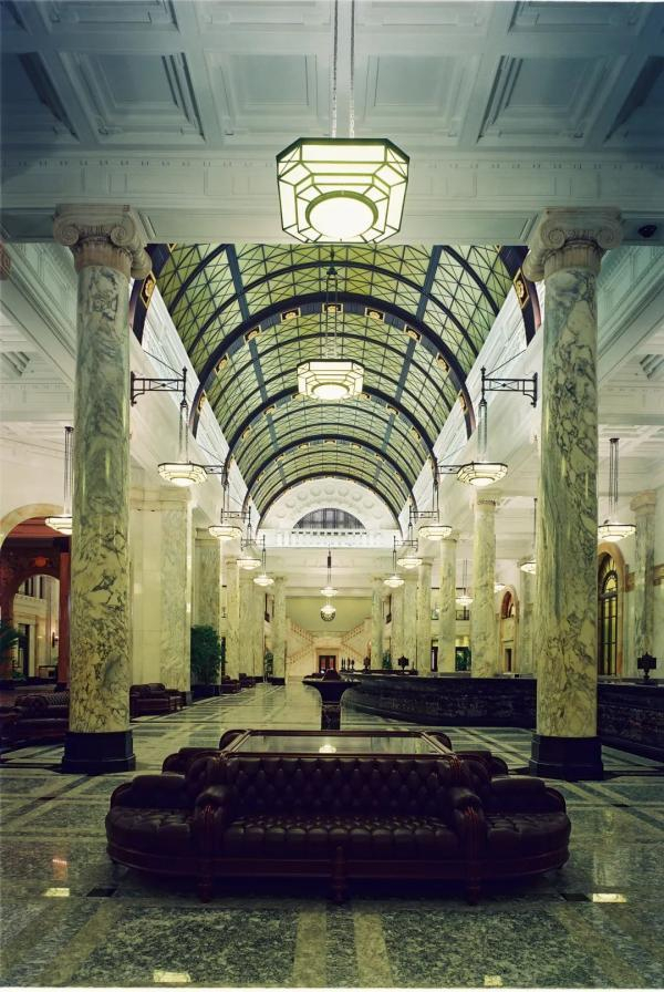 大楼营业大厅呈长方形,四周有28根大理石饰面的爱奥尼克式柱子。大厅中央为高13.2m的拱形玻璃天棚,天棚南北两端各有两根由整根大理石雕成的爱奥尼克式装饰圆柱。