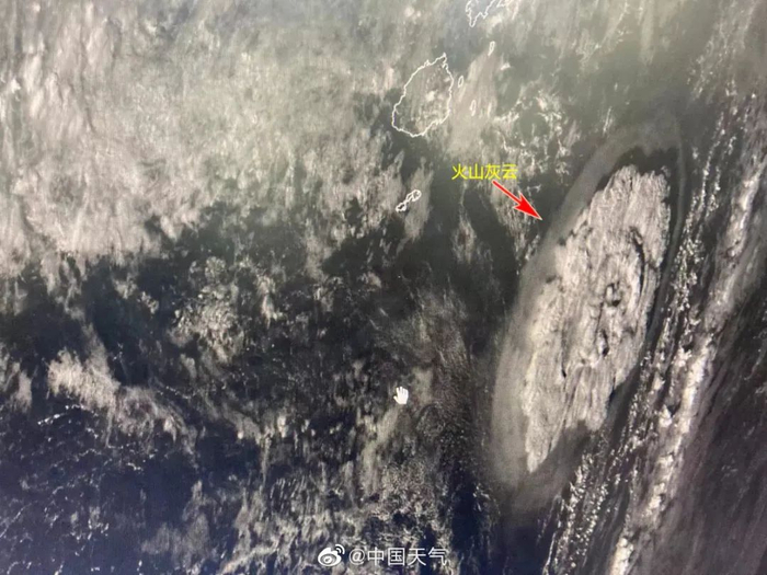 卫星图像显示,喷发的大片火山灰以及气体像蘑菇云一样,从蓝色的太平洋海域升起。