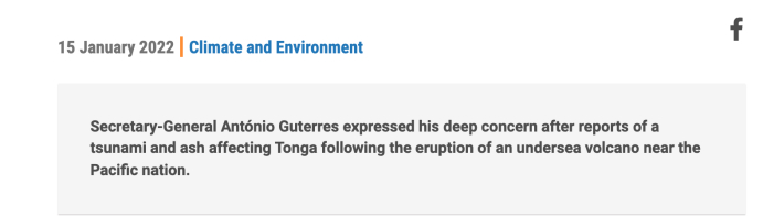 联合国网站消息称,由于汤加通信网络受到严重干扰,目前还没有关于人员伤亡或损害范围的报告。