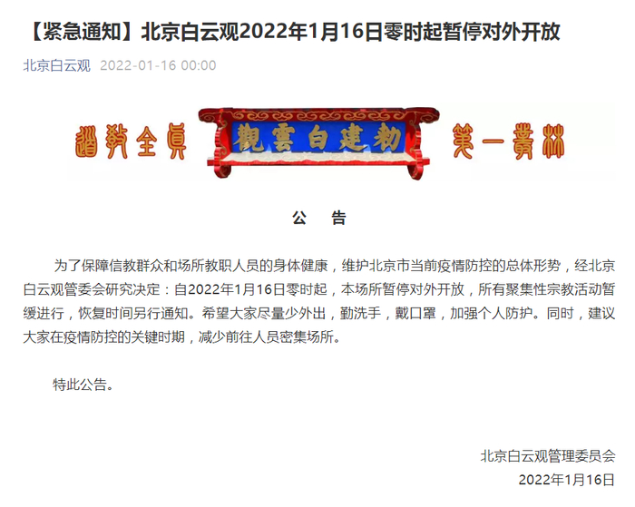 新京报快讯 据北京白云观官微消息,为了保障信教群众和场所教职人员的身体健康,维护北京市当前疫情防控的总体形势,经北京白云观管委会研究决定:自2022年1月16日零时起,本场所暂停对外开放,所有聚集性宗教活动暂缓进行,恢复时间另行通知。希望大家尽量少外出,勤洗手,戴口罩,加强个人防护。同时,建议大家在疫情防控的关键时期,减少前往人员密集场所。