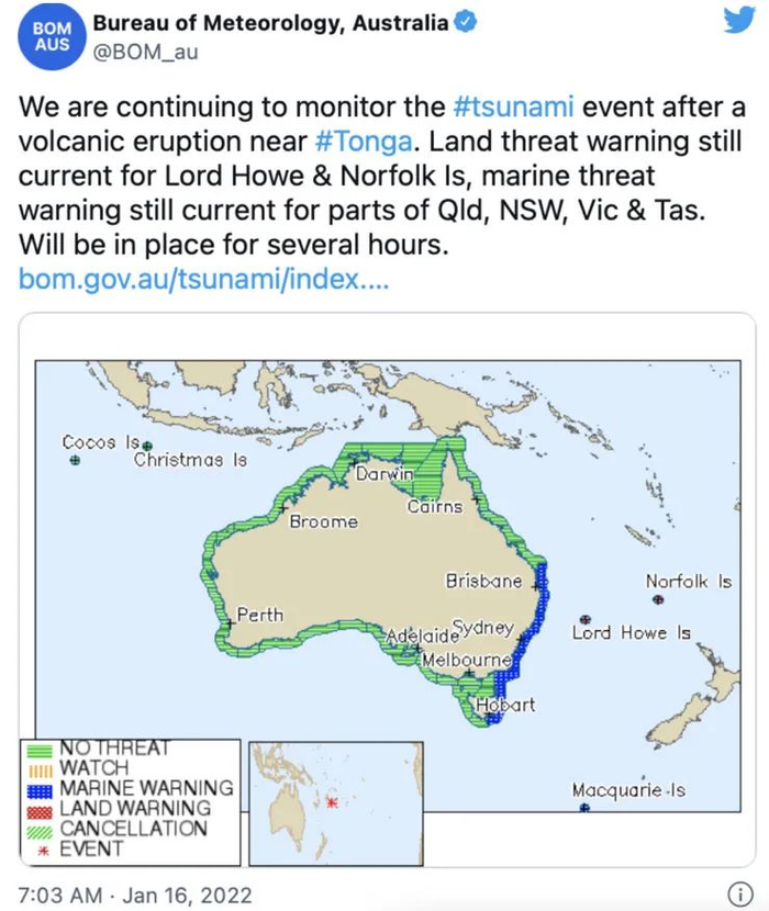 澳大利亚海啸预警中心发布离岸领土海啸预警,主要包括澳大利亚本土东部的岛屿诺福克岛。官方建议当地居民远离海岸,注意防范异常海流带来的安全风险,暂不建议采取撤离行动。