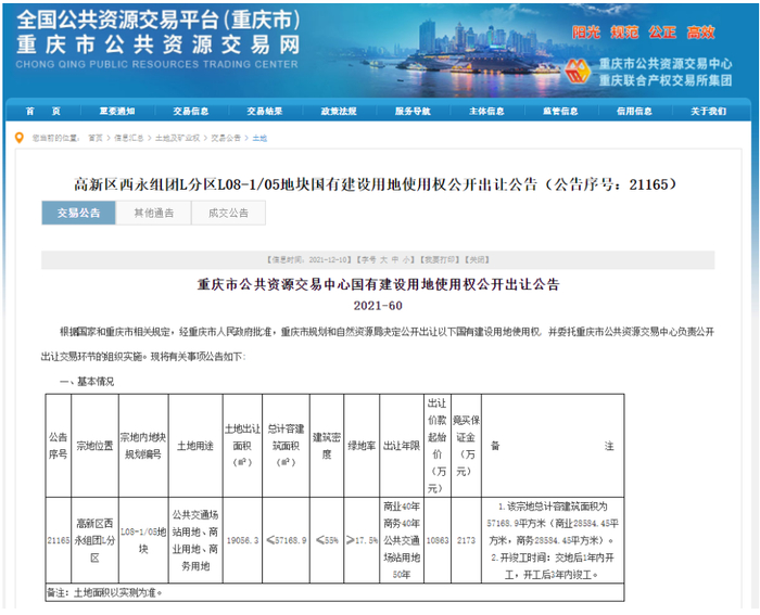12月10日,位于高新区西永组团L08-1/05地块的微电园项目在市公共资源交易网公开出让公告,出让起始价为10863万元(折合楼面单价约1900元/㎡),项目建成后,将实现轨道1号线与轨道7号线、轨道与公交、小汽车、出租车、自行车等多种交通方式的无缝换乘。