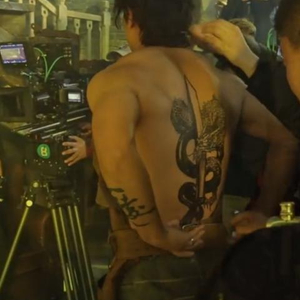 视频中,赵文卓赤裸上身,背后的一大片纹身相当抢镜,颇有一种黑帮老大的气质。