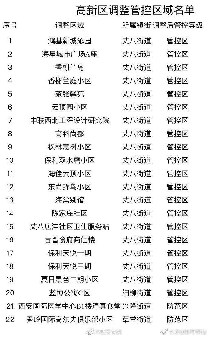 丈八街道鸿基新城沁园等4个街道的22个城市小区进行调整管理,其中20个调整为管控区,2个调整为防范区(具体名单见下表)。 其他区域管控措施不变。
