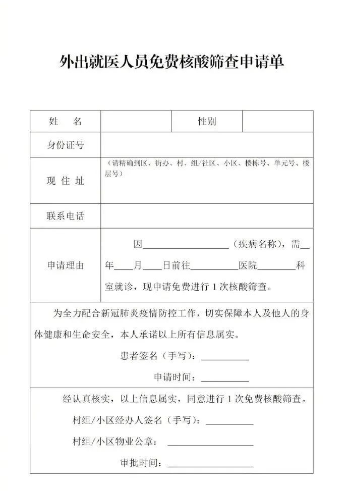 有就医需求的居民请填写《外出就医人员免费核酸筛查申请单》,经村组或社区物业签字盖章后,前往新筑或新合社区卫生服务中心进行核酸筛查。