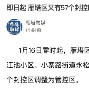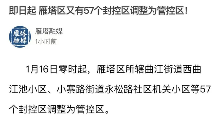 1月16日零时起,西安雁塔区所辖曲江街道西曲江池小区、小寨路街道永松路社区机关小区等57个封控区调整为管控区。