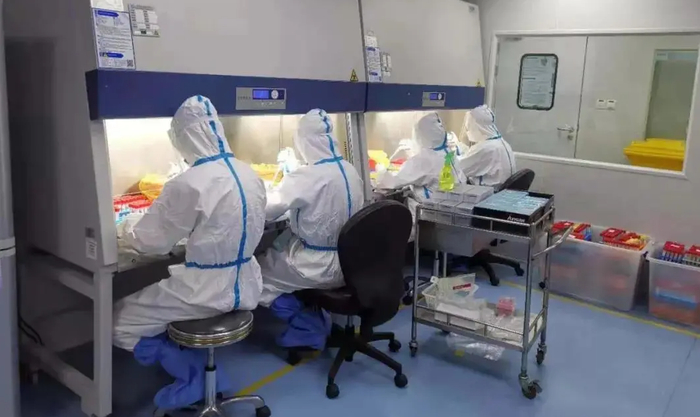 专车抵达实验室后,收样员把样本们安全交到实验室人员手中,实验员每个环节都用酒精喷洒消毒,