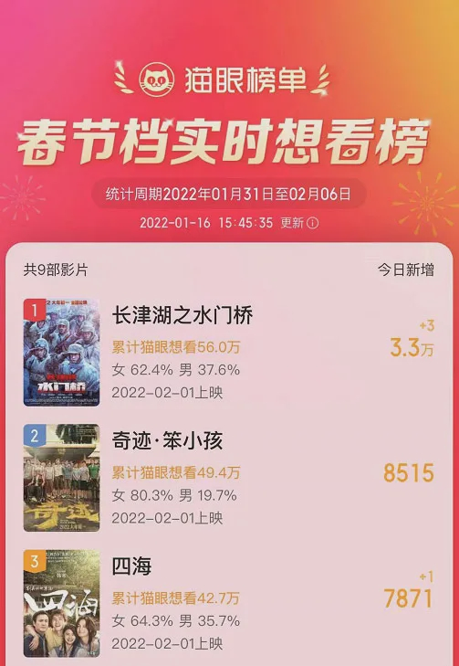 猫眼专业版数据显示,截至2022年1月16日15时,春节档电影“想看”榜排名前三的分别为《水门桥》、《奇迹·笨小孩》及《四海》三部影片。