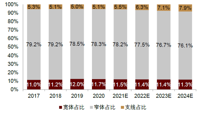 图表:我们预计行业机队中支线飞机占比提升