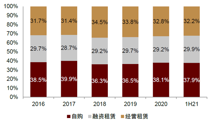 中国各航司机队的构成主要来自于自购飞机和租赁飞机(包含融资租赁和经营租赁)两部分,其中自购飞机是航司直接与主要飞机制造商签订单,而租赁飞机是航空公司从租赁公司租飞机。根据主要上市航司(国航、东航、南航、春秋、吉祥)数据,近年来机队中自购、融资租赁、经营租赁基本维持38%/29%/33%的比例不变。