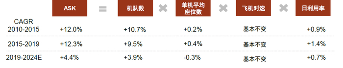 通过对历史每年行业供给(ASK)进行拆分,我们发现飞机数量的增长解释了较大部分的供给增速。2010-2019年行业ASK复合增速为12.1%,其中机队数、单机平均座位数、日利用率分别贡献10.2%、0.3%、1.1%。单机平均座位数主要由机型结构变化引起,相对来说是一个比较慢的变量;飞机利用率是短期航司可以调节的比较重要的指标,在受外部冲击时变化较大。