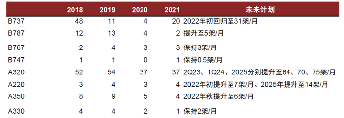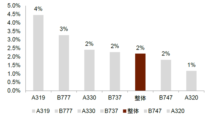 从上市航司数据看,每年退出飞机数量约占上年末机队数量2%,从结构上看,A319、B777、A330及B737机型的退出比例相对较高,我们假设未来每种机型的退出比例仍参考历史水平。