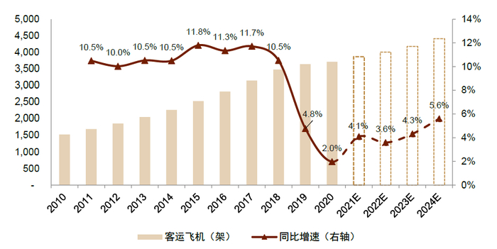 我们预计2021年-2024年我国民航运输客运飞机架数分别达到3869、4008、4181、4415架,2020-2024年复合增速为4.4%,低于十三五期间复合增速(8.0%)。