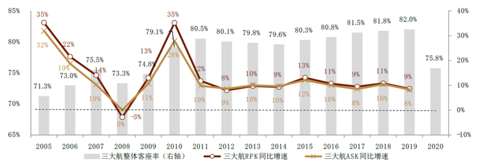 图表:三大航ASK、RPK及客座率变化