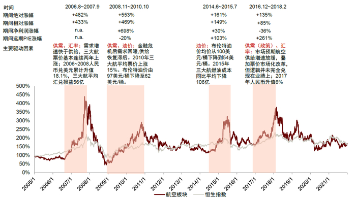 我们认为,通常航空板块系统性的投资机会离不开行业供需的错配(即供不应求)。我们回顾了2005年以来航空业4次大幅跑赢大盘的阶段,发现其中3次都有供需(预期)改善的因素存在,是支撑股价上行的重要动力。往后看,我们认为在未来2-3年中,航空行业有望出现阶段性的供需错配的机会,或持续推动股价上涨。