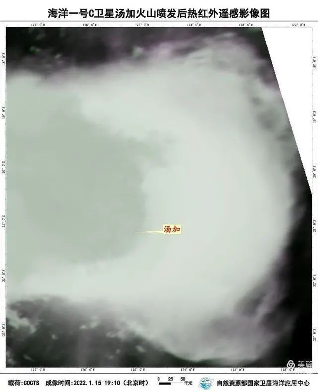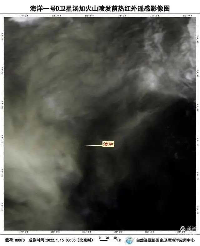 据央视新闻报道,国家卫星海洋应用中心提供的遥感影像图显示,喷发前4小时海洋一号D卫星经过该海域,喷发后约5小时、7小时、9小时后海洋一号C卫星和D卫星在夜间经过该海域,从红外遥感影像图能看到火山喷发后扩散与残留在空中的火山云,分布直径约500公里。
