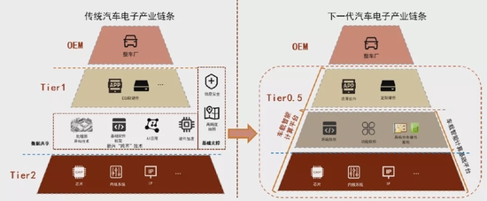 供应体系扁平化,传统Tier1的地位受到挑战。市场出现tier0.5级别的供应商,车企选择更加灵活的供应商进行共同开发。进入智能时代,汽车座舱域内发生的最重要变化是软硬件解耦,供应格局逐渐从原来的垂直化转向扁平化,甚至竞争实力较强的主机厂也有意图培养自身的软件实力。传统的汽车供应体系由Tier 1整合各个ECU、屏幕、机械电子料等组件为OEM提供打包方案,供应链呈现较为垂直的上下游关系。进入智能时代后,Tier0.5级别供应商和主机厂建立联合开发合作关系,共同开发高算力芯片与系统级操作软件解决方案,推动行业形成新的竞争格局。