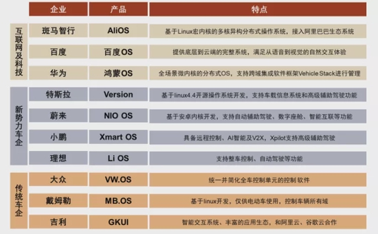企业积极布局智能座舱软件生态。操作系统为智能座舱提供底层软件基础,操作系统的平顺性与流畅度,以及基于操作系统的UI界面、软件生态均会影响消费者的驾乘体验。从市场参与者来看,车企和第三方供应商均提供了操作系统解决方案:1)车企通常会打造属于自有IP的操作系统,例如大众VW.OS、比亚迪DiLink、蔚来NIO OS、小鹏XmartOS等。这些车载操作系统基于Linux、Android等基础系统进行定制化开发。2)第三方供应商为不同车企打造操作系统,如华为Harmony OS,AliOS等。
