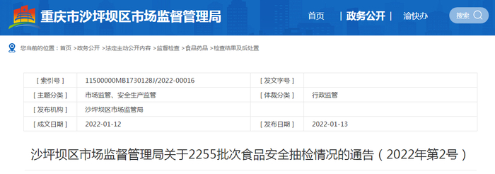 中国质量新闻网讯 2022年1月13日,重庆市沙坪坝区市场监督管理局网站发布关于2255批次食品安全抽检情况的通告(2022年第2号)。通告称,近期,该局组织抽检饼干、餐饮食品、茶叶及相关制品、速冻食品、糖果制品、调味品、饮料等22类食品2255批次样品。抽样检验项目合格样品2216批次,不合格样品39批次。检测项目见附件。根据食品安全国家标准,个别项目不合格,其产品即判定为不合格产品。