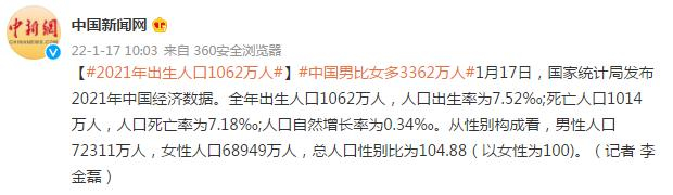 【#2021年出生人口1062万人#】#中国男比女多3362万人#1月17日,国家统计局发布2021年中国经济数据。全年出生人口1062万人,人口出生率为7.52‰;死亡人口1014万人,人口死亡率为7.18‰;人口自然增长率为0.34‰。从性别构成看,男性人口72311万人,女性人口68949万人,总人口性别比为104.88(以女性为100)。(记者 李金磊)