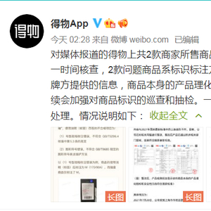 中新经纬1月17日电 17日凌晨,得物App官方微博回应“央视曝得物直播产品抽样不合格率50%”称,经核查,2款问题商品系标识标注方式不符合最新规定,已先行下架。