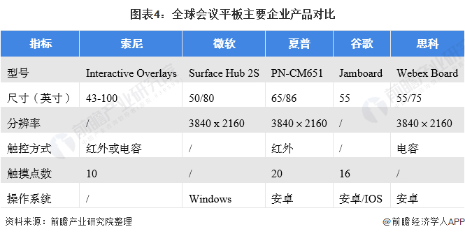 目前国际上会议平板的主要参与者包括Microsoft微软、Google谷歌、Cisco思科、Boxlight宝视来、Sharp夏普、Panasonic松下等。