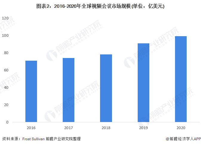 根据Frost&Sullivan数据,2019年全球视频会议市场规模为91亿美元;2020年,全球视频会议市场份额为99亿美元。