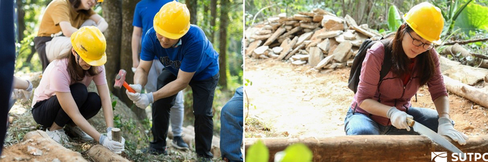 设计师与志愿者们亲身参与锯木头、削木钉、铺台阶、夯实等一系列手作步道修建的完整过程。