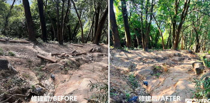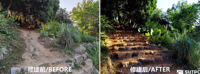 修建前路面崎岖不平,难以行走;修建后,顺势修建了“之”字形的原生态坡道,维持自然土石与落叶铺地,没有积水泥泞与湿滑。