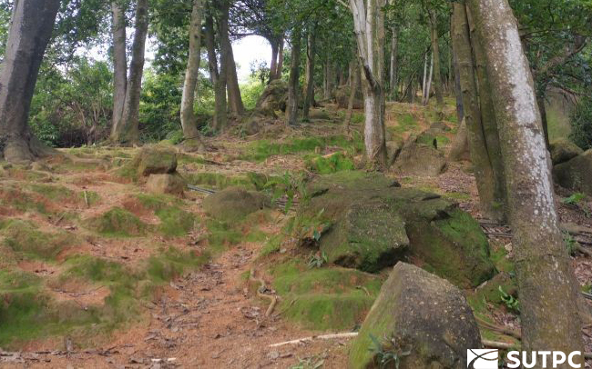 步道上散落众多不稳、尖锐石块,易发生踩滑与绊脚。