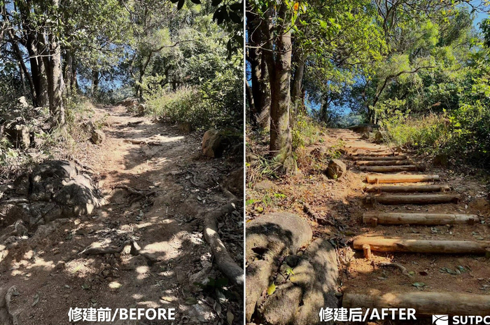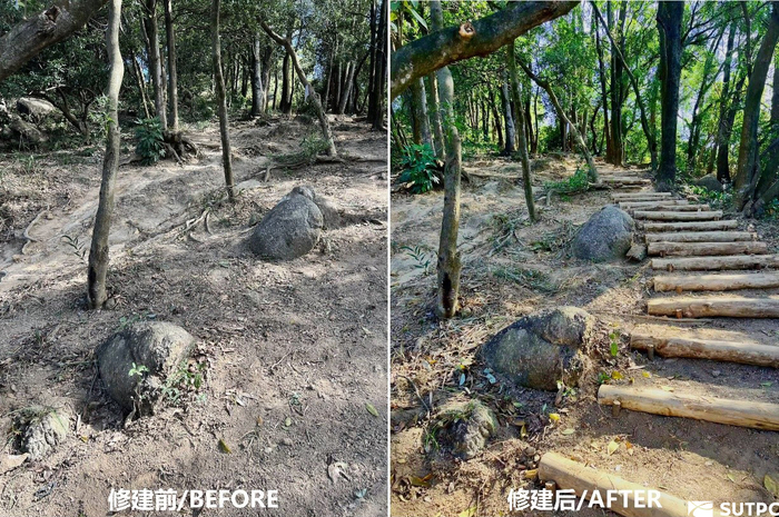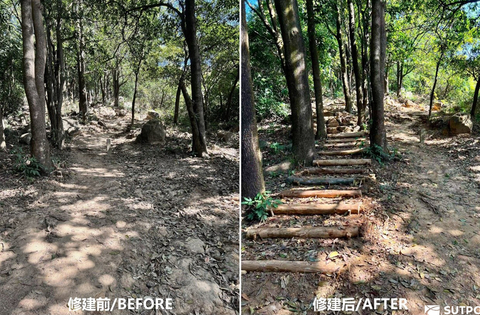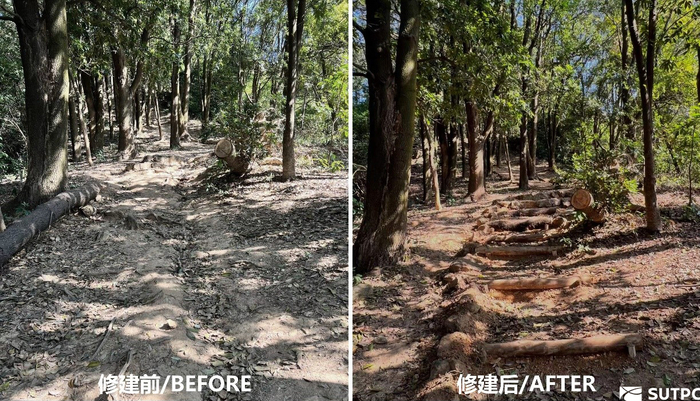 相比传统登山道冰冷的水泥路和石台阶,保留原有样貌的手作步道,不但易维护、成本低,而且路面更加有弹性,不会损伤膝盖,更为重要的是对自然做到最小影响。
