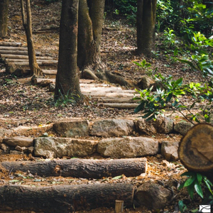 就地取材形态各异的木头和石头,在保留原有样貌的基础上,将之化做弥补流失路基的护坡路缘与台阶。