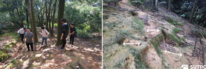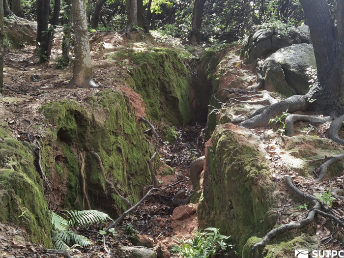 雨水冲刷形成的沟壑较宽,青苔遍生,登山者无法直接行走。