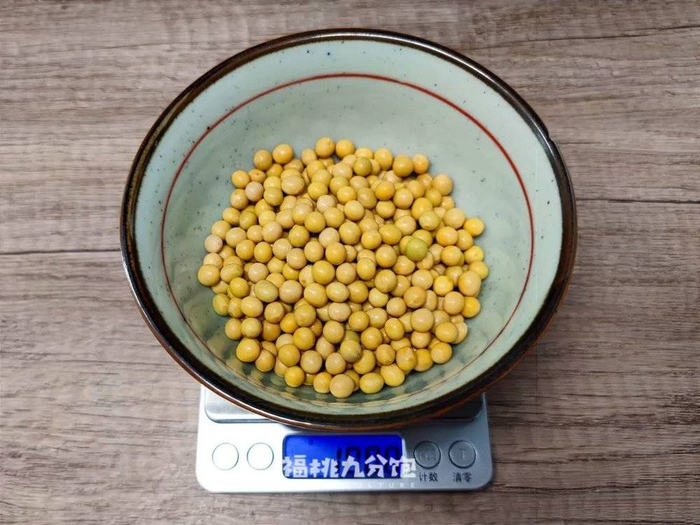 为了测之后的脱水率,所以我称了100g的黄豆,也刚好可以铺满空气炸锅。有容量大的空气炸锅或用平底锅的可以适当增加克数,只要保证最后黄豆是平铺在锅底没有互相堆叠即可。