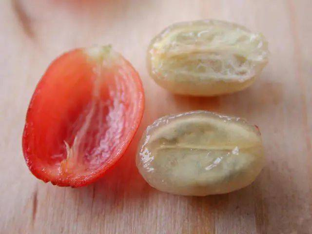 从植物层面来看,咖啡是茜草科的多年生常绿灌木或小乔木,每个咖啡果切开之后露出的果核才是最原始的咖啡:浅色,外面包裹着一层果胶,所以咖啡其实是咖啡果的果核。