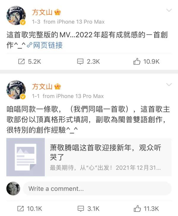 作词人方文山也于1月1日和3日接连发布《我们同唱一首歌》的宣传微博,自豪地称这是他“2022年超有成就感的一首创作”。