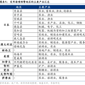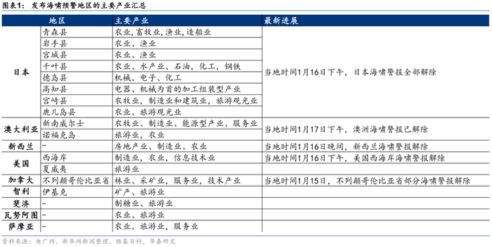 本次汤加海域火山爆发及引发的海啸直接导致汤加全国通信与互联网服务中断;环太平洋多国受其影响,发布了海啸预警或已受到海啸影响。目前维持海啸预警的地区,大部分以农业、渔业、旅游业及采矿业为主产业。其中,澳大利亚、新西兰等国在全球乳制品、新鲜蔬果等农产品供应链中的地位举足轻重,且易受火山再次爆发带来的次生影响。我们认为,汤加火山的爆发有可能会加剧今年北半球拉尼娜现象导致的农业减产压力;若喷发持续,加速全球气候变化,或会增加新能源供给压力;若火山灰大面积扩散,或进一步影响全球航空业,降低运输效率,拖累全球供应链。影响仍需跟踪评估。