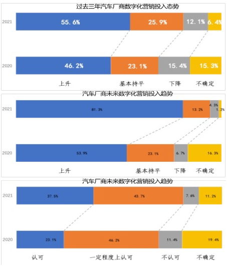 对汽车厂商的调研数据显示,有81.3%的受访者表示未来将进一步加大数字化营销投入,这一比例较2020年大幅增长了27.5个百分点,而认为数字化营销投入将下降的受访者较2020年小幅下降,占受访者比例为4.3%,汽车厂商对于数字化营销投入前景较为理想。有81.2%的汽车厂商受访者认可或一定程度上认可数字化营销对于汽车销量的拉动作用,较2020年上升11.9个百分点,同时持更为确定的积极态度的受访者占比达到37.6%,较2020年上升14.5个百分点,表明汽车厂商对数字化营销的带动作用普遍看好。