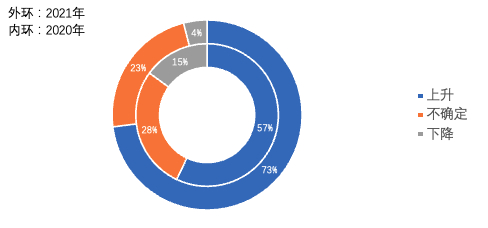 在对数字化营销企业的调查中,有73%的受访者认为未来汽车行业数字化营销市场规模仍将呈现上升态势,较2020年上升16个百分点;持不确定态度的受访者与2020年小幅下降至23%;不看好数字化营销的受访者从2020年的15%大幅下降至4%。在当前行业发展背景下,市场规模整体受到看好,部分从业者对未来市场的乐观程度较为谨慎。