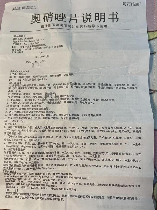在记者购买的处方药“阿司维康奥硝唑片”说明书上,里面明确提到,该药品禁用于奥硝唑或其他咪唑类衍生药物过敏者,禁用于患有中枢神经系统疾病的患者,禁用于癫痫及各种器官硬化症患者,禁用于血液恶性疾病或其他血像异常的患者。