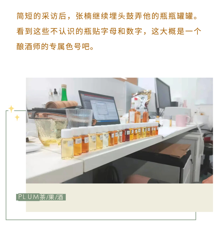 成为一个彻彻底底的酿酒师之前,张楠是个很懂茶道的雅士,偏好龙井。茶+果+酒的灵感,乍现自被疫情隔离的一天里的突发奇想,“如果把冷泡茶加在果酒里,会是什么味道?”一位野生酿酒师,就此诞生。