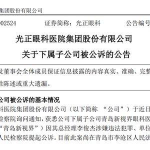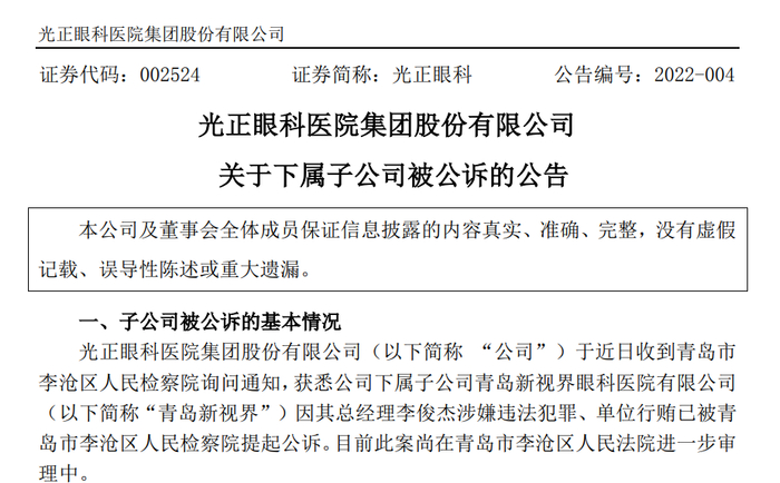 2022年1月17日,光正眼科医院集团股份有限公司(以下简称“光正眼科”)发布一则关于下属子公司被公诉的公告。公告显示,光正眼科于近日收到青岛市李沧区人民检察院询问通知,获悉公司下属子公司青岛新视界眼科医院有限公司(以下简称“青岛新视界”)因其总经理李俊杰涉嫌违法犯罪、单位行贿已被青岛市李沧区人民检察院提起公诉。