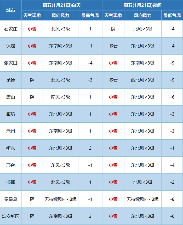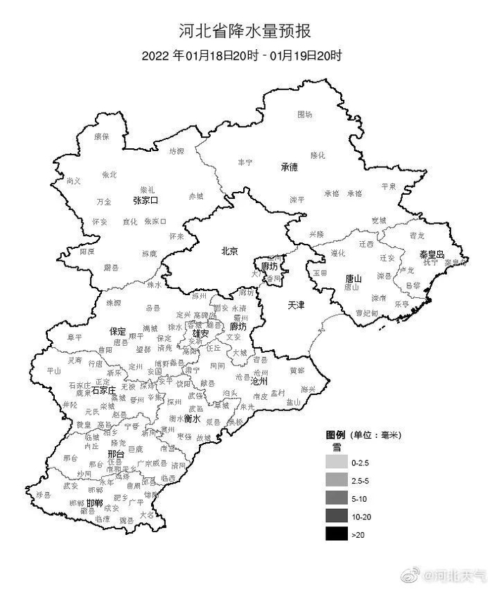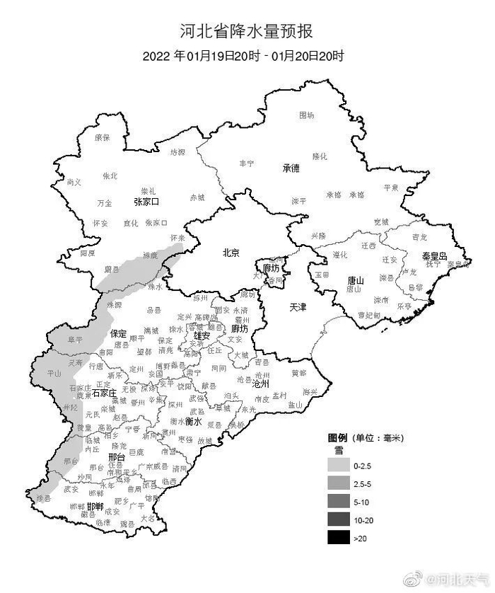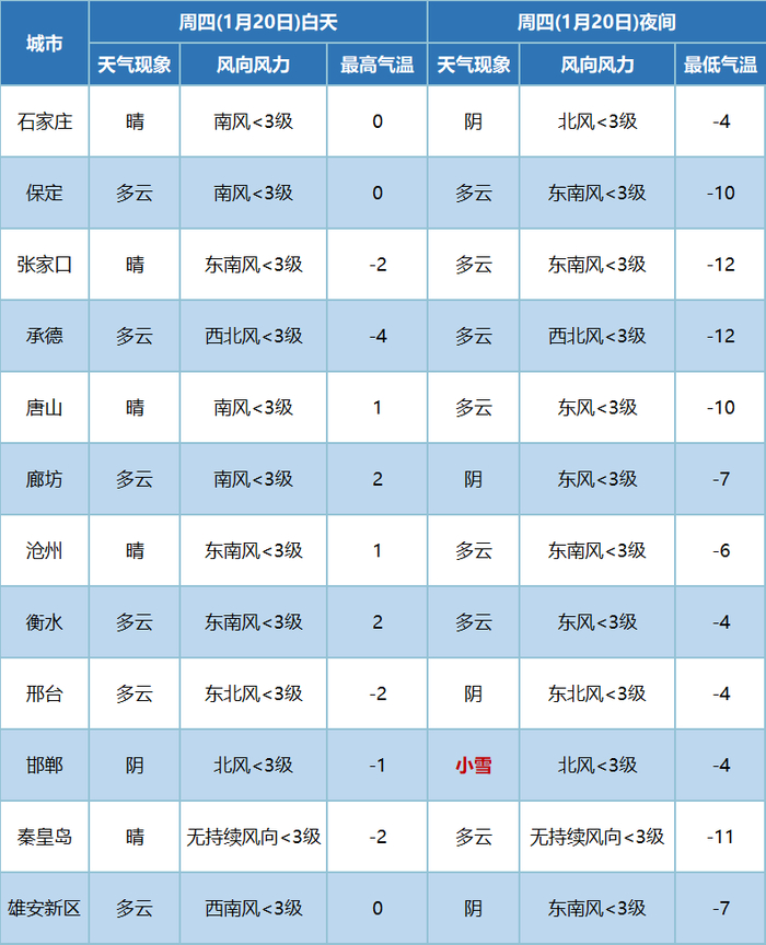 明天夜间到20日,保定、石家庄、邢台、邯郸四个地区的西部多云转阴有零星小雪或小雪,其他地区多云。