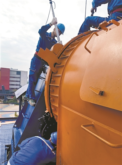 在顶部平台检查的维护员,需要检查上面的驱动系统,包括6台电机跟齿轮箱以及传感器等。采访当天,轮到高级维护员杨英杰到平台检查,只见他把安全带系好,扣在设施检修梯的导向槽后便一步一步往上爬,爬至26米高空,一检便是1个小时,看得人胆战心惊。杨英杰则觉得是稀松平常事,“冬天北风呼啸,夏天则十分炎热。爬了两年,我都习惯了。”