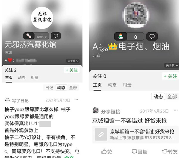 同时,记者在探探、虎扑、豆瓣等多个社交平台上都找到了电子烟销售的相关信息,均在个人主页上明确暗示有电子烟销售。