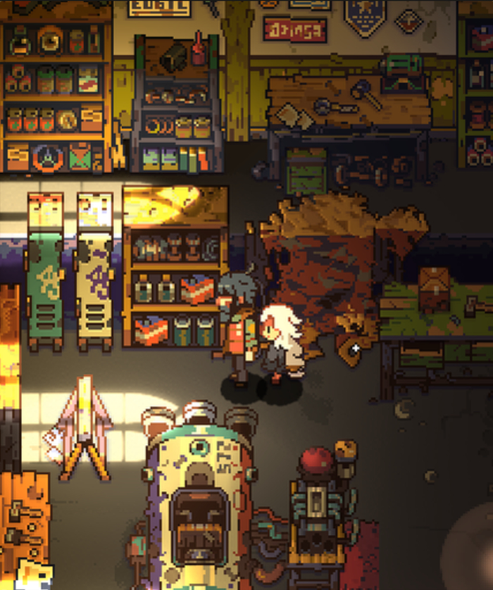 像素画风下,不少游戏场景有了吉卜力动画的末日时代氛围,带来一种魔幻和怪异的融合感,又显得生机勃勃。